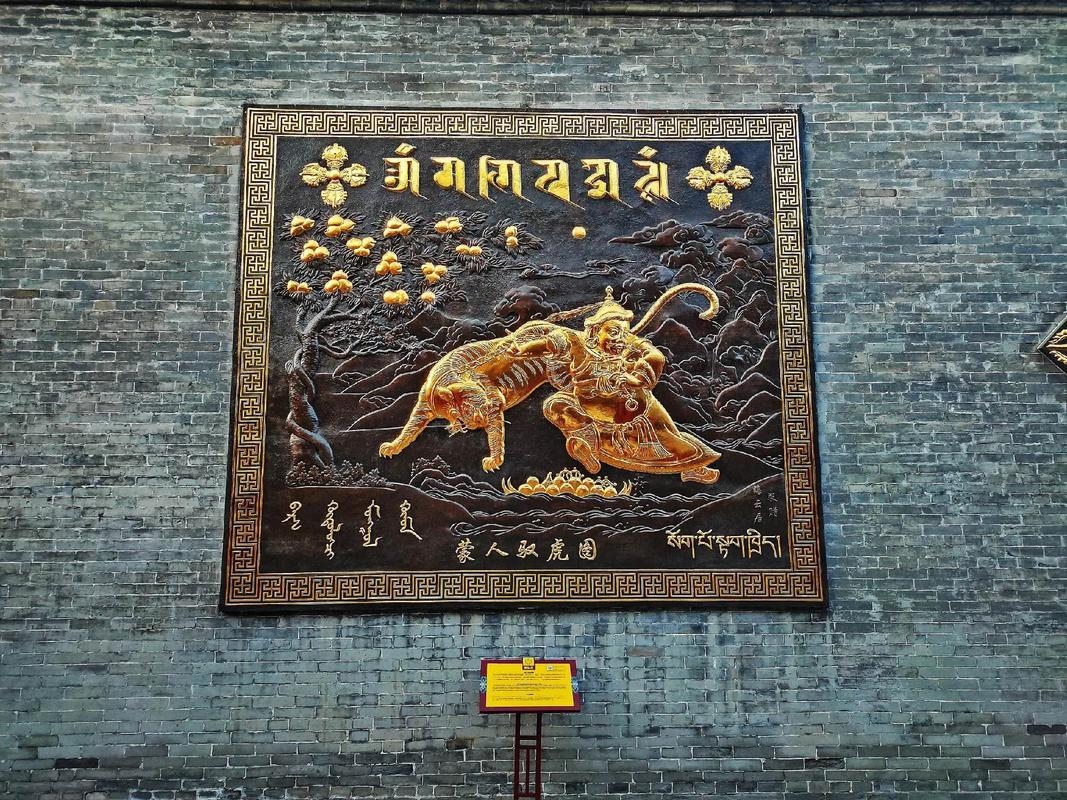 进入山门,看到一座高大的影壁,也叫照壁,是一座高大的墙,堵住里面,不要让人在大门外就看见里面。通常达官贵人家里都有照壁,广仁寺属于皇帝敕建,所以就按皇家的规制修建,就有高大的照壁。照壁正中是铜制的浮雕图“蒙人驭虎图”。