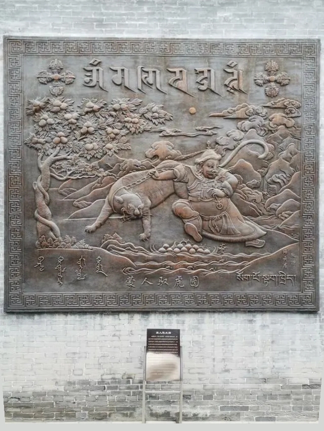 进入山门,看到一座高大的影壁,也叫照壁,是一座高大的墙,堵住里面,不要让人在大门外就看见里面。通常达官贵人家里都有照壁,广仁寺属于皇帝敕建,所以就按皇家的规制修建,就有高大的照壁。照壁正中是铜制的浮雕图“蒙人驭虎图”。