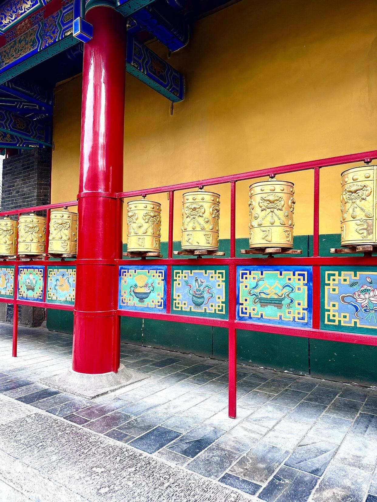 绿度母殿外走廊安置转经筒,共四十四个环绕大殿。转经筒主体呈圆柱形,中间有轴以便运转。圆筒上刻有藏传佛教的六字真言,圆筒中间同样装有经咒。转一圈经筒相当于持诵十万遍六字大明咒“嗡嘛呢叭咪吽”。
