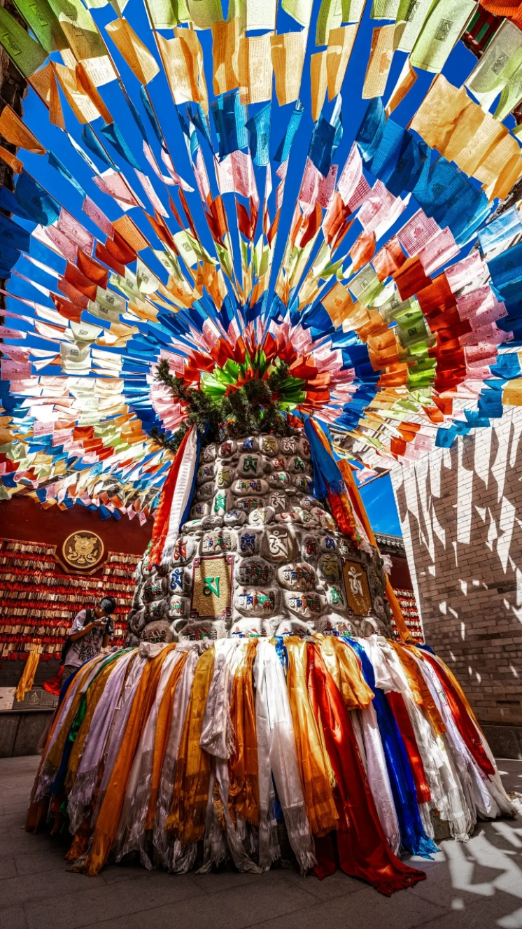 广仁寺的“都市敖包”:敖包在仁钦上师(现在广仁寺住持)的家乡——内蒙古地区随处可见,现在已演变为成为祭山神、路神和祈祷丰收、家人安康平安的象征。仁钦上师欢迎新人来敖包拍摄,这也是为新人们送上的一份祝福。都市敖包后面的许愿墙上挂着许多人的许愿牌,许下爱情的诺言,期待走向婚礼的殿堂。