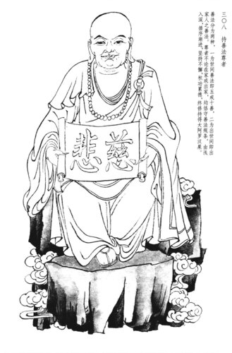 汉地寺院供奉的五百罗汉,其名号与次序大多源于南宋绍兴四年所录的 《江阴军乾明院罗汉尊号石刻》,从第一阿若憍陈如到第五百愿事众者。在我绘制五百罗汉白描图稿之同时,我为了尽量多地找出一些出处或者故事,因此查阅了一些佛教文献的记载,经对照比较,可以看出五百罗汉大致分为三种类型: