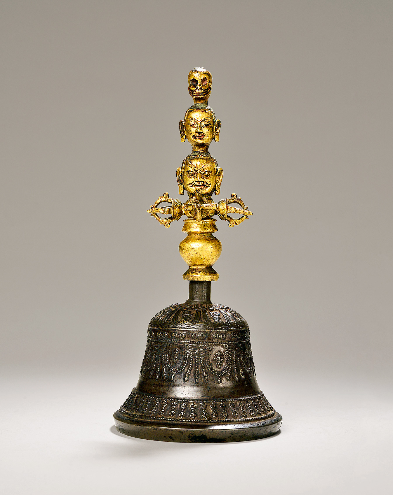 铃是藏传佛教常用法器之一,也称为藏铃、金刚铃等,常在修法时摇响,是诸尊警告有情,使之喜悦的法器。因其体坚固,故称金刚,又因其形为五钴形,故亦称五钴铃。藏传佛教视之为代表智德的法器。杵是佛教法器名,原为古印度的一种兵器,佛教密宗用以示坚利之智,是断烦恼、伏恶魔的法器。用金、银、铜、铁或硬木制成,长八指至十六指,其中以十六指为上,十二指为中,八指为下,两端有独股、三股、五股。一般认为金刚杵象征菩提心,不持金刚杵念佛,念佛就达不到目的。