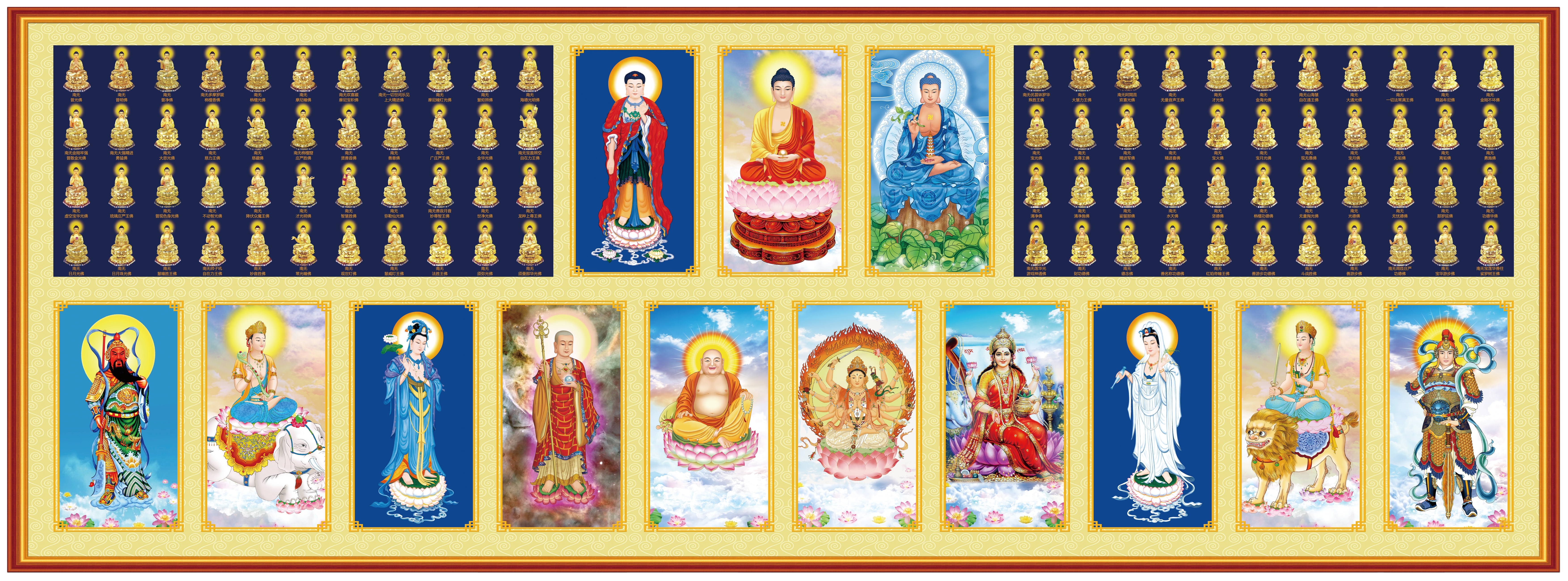 末学不才,不知《佛说决定毗尼经》35佛中【释迦牟尼佛】是否为本师释迦牟尼佛。思量许久,仍然照此88佛制图,若为同一佛,即使与图中第一行正中间本师释迦牟尼佛重复,也没关系。